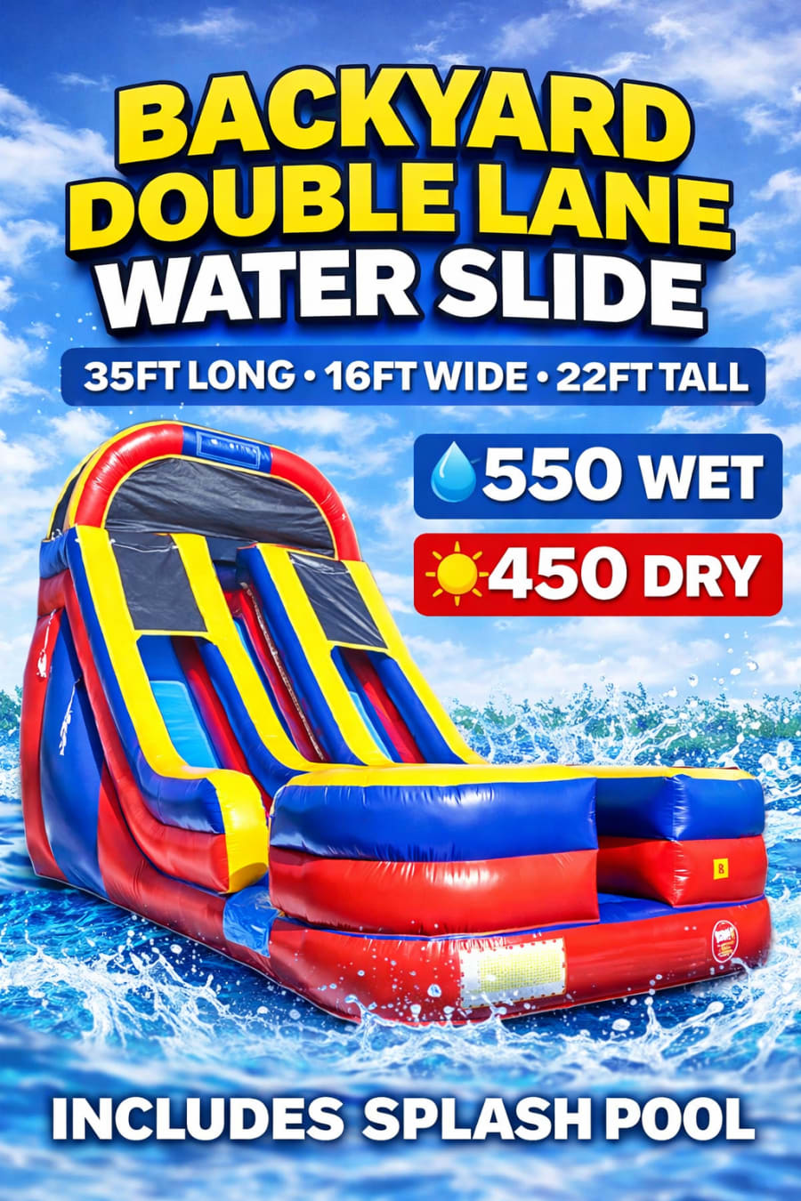 The 2 Lane Backyard is a thrilling, family-friendly water slide. It stands 22ft high and drops into a roomy splash pool. Fast lanes, big thrills, and safe design make it perfect for summer parties. Quick to set up. Easy to store. Built to deliver nonstop fun for kids and teens. 🎉