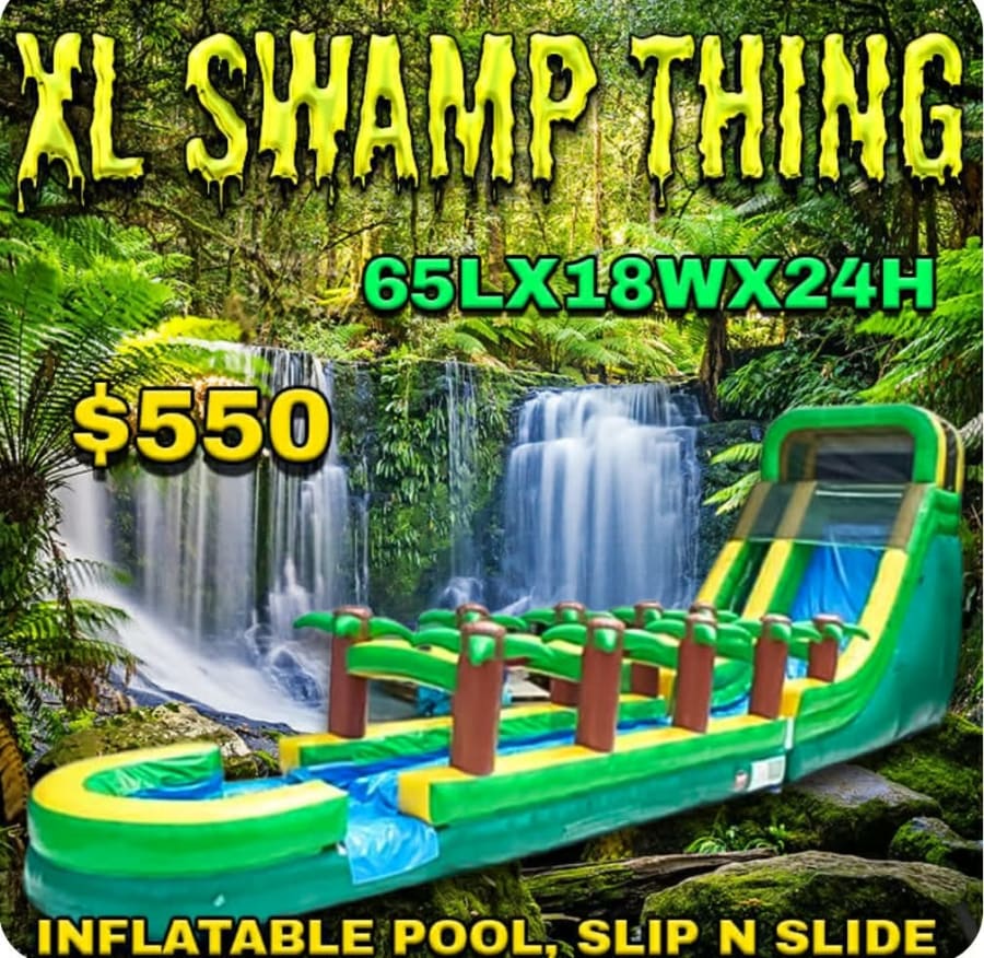 Make your summer epic. Rent XL Swamp Thing and deliver non-stop thrills. This giant green water slide stands 24 feet high. Riders scream down into a long slip-n-slide and splash into a pool. The palm-tree swamp design adds wow factor and photo moments. Perfect for parties, company events, and weekend rentals. 🐊🌴💦