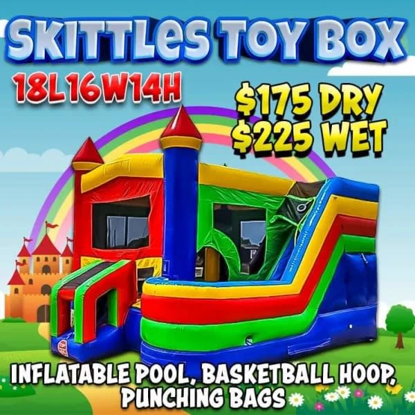 The Skittles Combo delivers colorful, active play for kids. Bright colors catch attention. A slide leads to a soft area. Inside, a basketball hoop and a punching bag add sporty, imaginative fun. This combo is designed for backyard parties, family days, and energetic play sessions. 🏀🥊