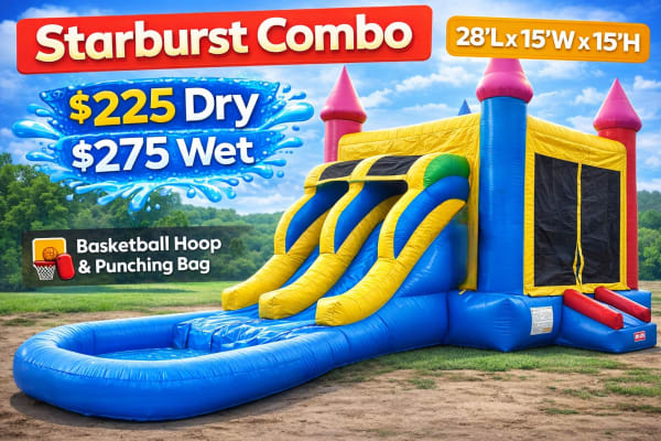 The Starburst is a vibrant dual-lane slide that sends kids racing down into a shallow splash pool. It combines bright, eye-catching graphics with active play elements. Inside the pool area you'll find a basketball hoop and a soft punching bag for added fun. Quick to inflate. Built for repeated use. Perfect for parties, rentals, and backyard events. 🌟💦
