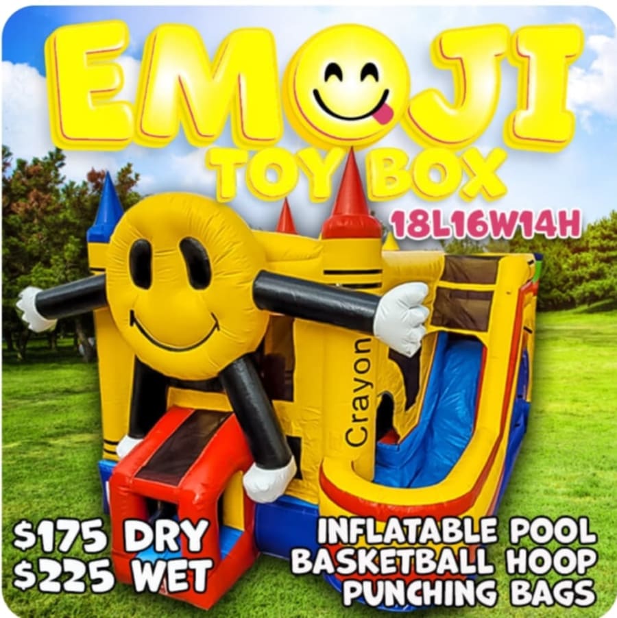 Bright. Fun. Safe. The Emoji combo is a yellow toy box play center with a slide that lands in a shallow splash area. Perfect for summer parties, backyard events, and family fun days. Parents love the durable design. Kids love the giant 3D smiling emoji. Rent Emoji combo for an instant crowd-pleaser. 🌟