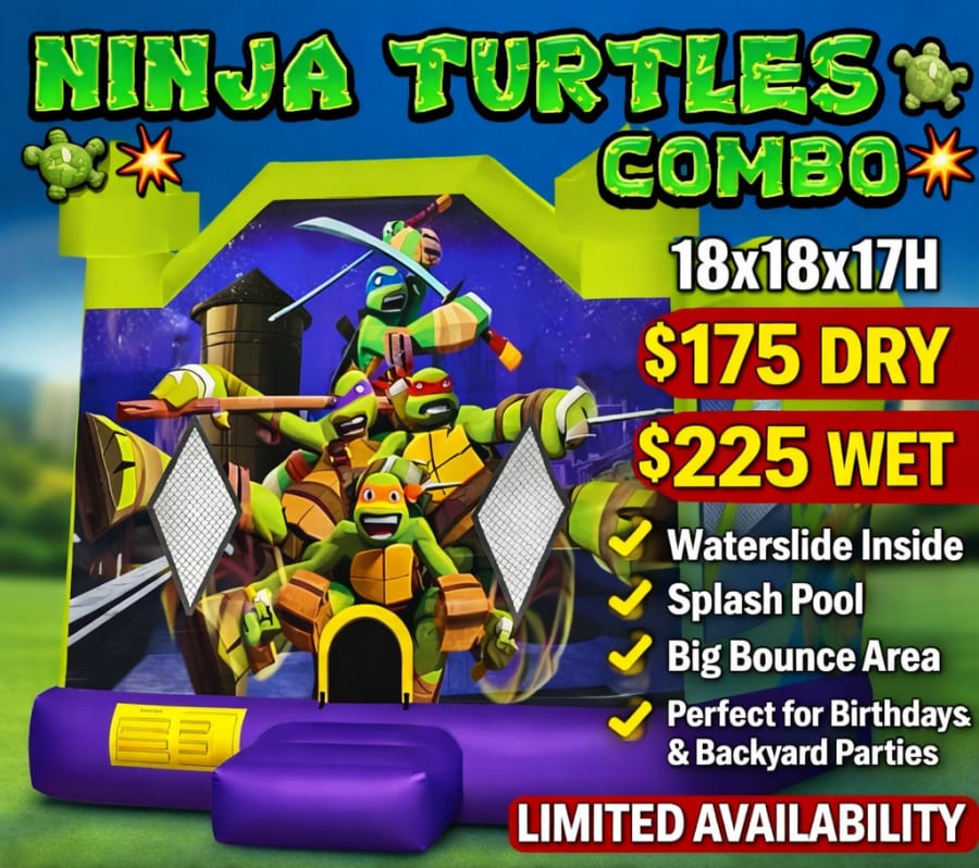 Be the hero of your next event with the Ninja Turtles inflatable. This mean green inflatable features a tall slide and splash landing. Kids climb, slide, and splash safely. Parents relax while guests' cheer. Perfect for backyard birthdays, community events, summer camps, and block parties. Rent Ninja Turtles to transform any gathering into an action-packed adventure. Competitive rates and flexible booking make planning easy. ๐ŸŽ‰