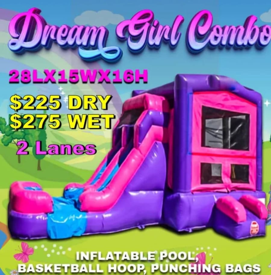 The Dream Girl Combo is a vibrant pink inflatable with two lanes and a splash pool. Rent the Dream Girl Combo for birthday parties, school fairs, and backyard celebrations. It delivers high-energy fun with a hoop and internal punching bag for extra play options. Quick setup and durable build make it ideal for repeated rentals. ๐๐