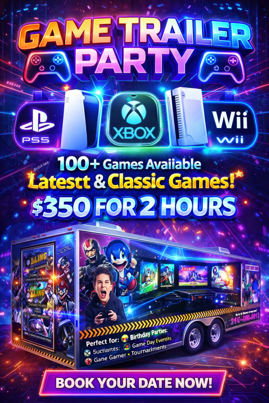 Games Trailer delivers a full-scale, mobile gaming arena built for parties, festivals, and corporate events. Enjoy PlayStation 5, Xbox, Wii consoles, room for up to 16 players, and climate control with both AC and heating. Fast setup. Immersive play. Unforgettable moments.