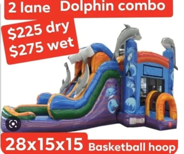 The 2 lane Dolphin Combo ( DRY ) delivers dry, two-lane inflatable fun built for kids. Bright dolphin graphics and dual lanes create fast races and endless smiles. Compact, safe, and easy to set up, this combo is ideal for birthday parties, school events, and backyard play. Perfect for active play with water. 👦👧